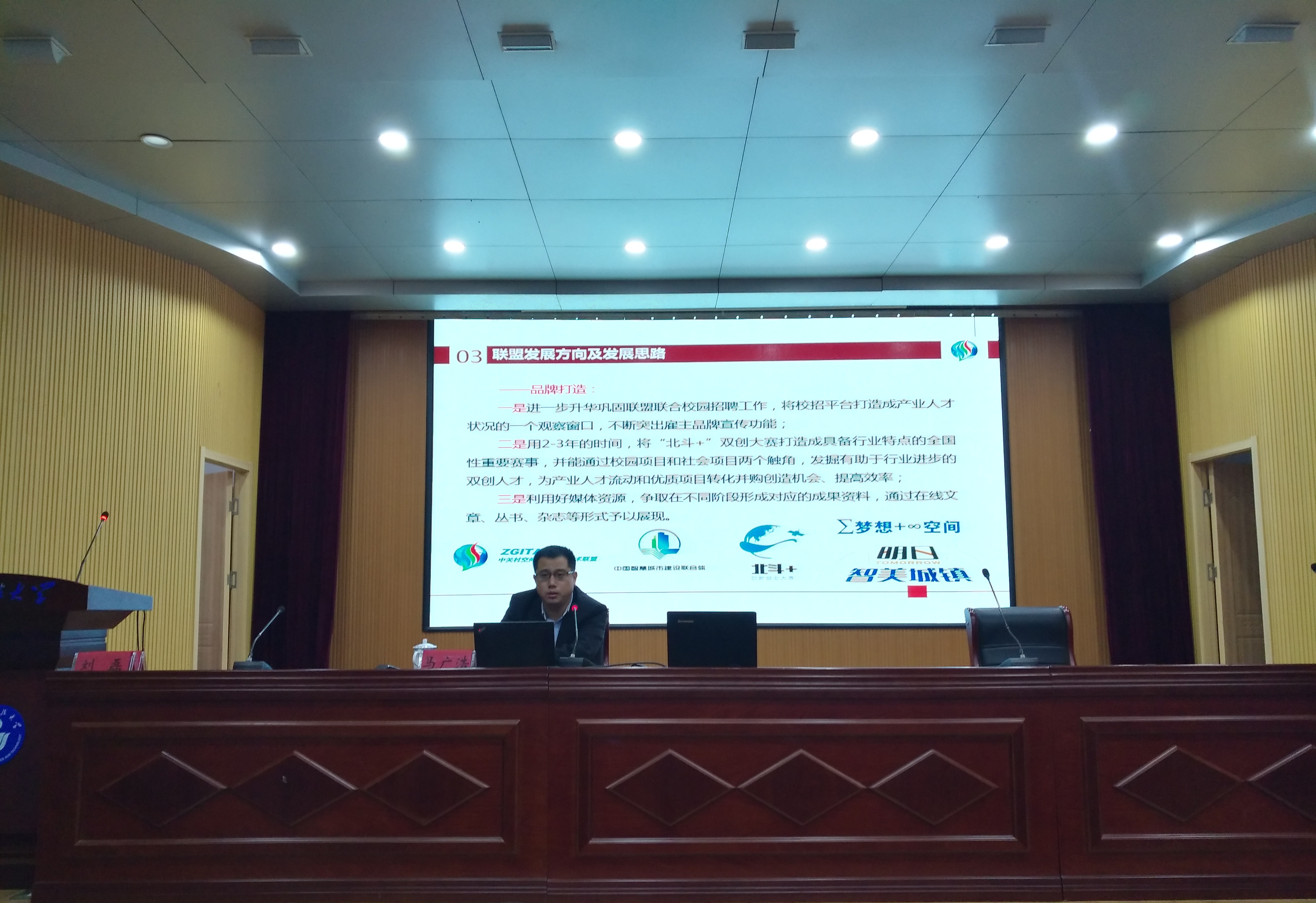 报告会首先由马广浩先生对中关村空间信息产业技术联盟活动进行介绍,对中关村空间信息产业技术联盟的团队成立,工作目标,组织结构,联盟产业服务体系,人才战略等进行介绍。随后刘磊总经理针对从大型基建工程行业市场需求、空间信息技术与智慧建造的多元融合、商业模式及产业化运用、企业创业目标及前景进行了全面详细的讲解,企业及科研创新团队的具体情况由其助手进行了介绍。报告最后由陈应东讲授时空数据的感知融合与动态应用,他从时空数据的基本构成要素及环境讲起,针对动态应用,感知融合以及如何打造时空数据的动感应用进行详细的介绍与说明,并希望同学们能积极主动的参与到这个研究方向来。