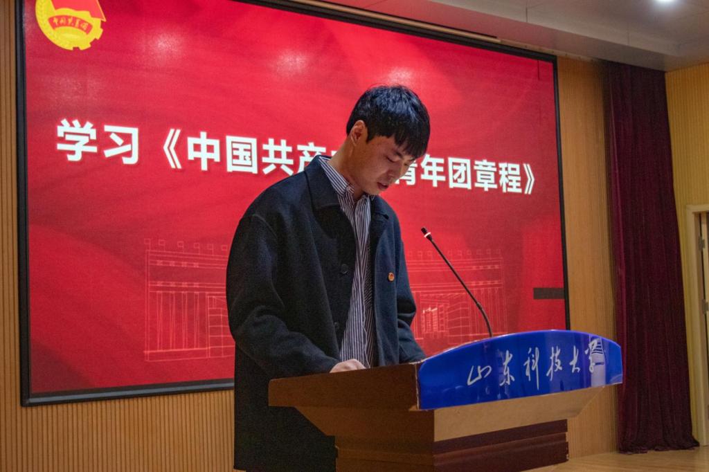 仪式在庄严的国歌声中拉开帷幕。化工学院辅导员孙梦柯宣读《中国共产主义青年团章程》中有关团员义务和权利的条款。耿倩宣读新发展团员名单,并向新团员代表颁发团员证。易凡、马韶霞为新发展团员代表佩戴团徽。38名新团员在领誓人王宏力的带领下,面向团旗庄严宣誓,活动现场全体团员重温入团誓词,他们用最洪亮的声音喊出自己的名字,表达出自己勇担时代重任的决心。新团员代表付宇轩和优秀团员代表王奕苏分别发言。随后,材料公司党委副书记兼副经理李建楠宣读青马工程基础班方案,并详细介绍培训内容和目标。