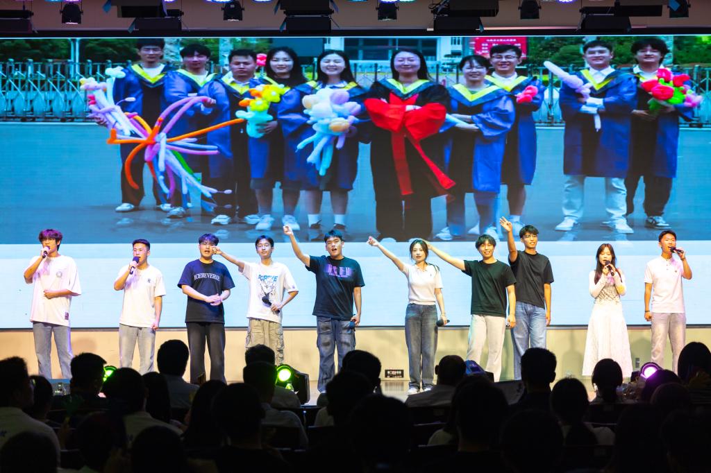 在第二篇章中,老师们对毕业生们的祝福展现在大屏幕上,老师为毕业生们送上临别赠言,希望他们在未来的日子里不忘初心,砥砺前行。这一幕温馨感人,许多师生不禁热泪盈眶。晚会还设置了“伟德bv1946官网2025届毕业生心目中难忘恩师”奖及颁奖仪式,毕业生们向老师们表达最诚挚的谢意与祝福。游戏环节,员工们默契配合,欢声笑语不断,温情四溢。舞蹈串烧动感而优美,将青春的活力展现的淋漓尽致;毕业生刘兴才带来的弹唱《情非得已》和《我的青春》诉说着青春的懵懂。最后,晚会在大合唱《等你下课》中圆满结束。熟悉的旋律,是对校园的眷恋,对同窗的不舍,更是对未来的憧憬。