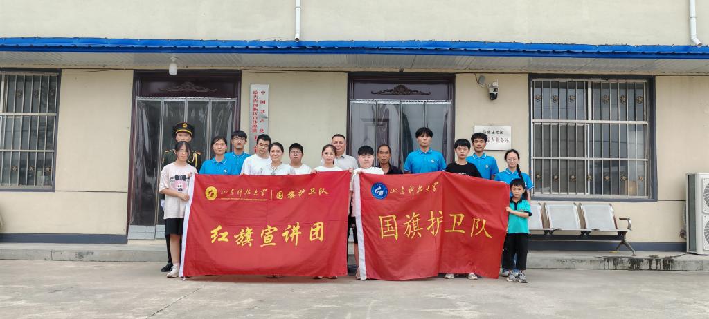 临别前,实践队全体队员与马合庄村两委干部在村委会门前合影留念。队员们手持国旗护卫队“红旗宣讲团”旗,与村干部们和孩子们共同定格下这次难忘的共建瞬间。
