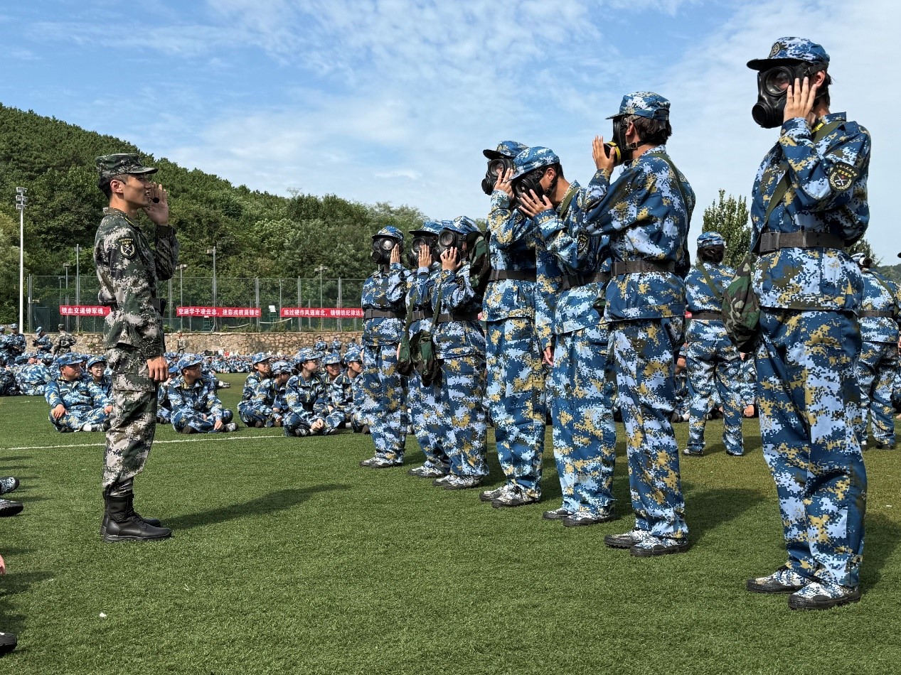 金秋时节,天朗气清,高地操场上旌旗微动,2025级新生军训正在如火如荼进行。伴随着清晨的阳光,测绘学子们开始了防毒面具佩戴的学习以及95式的操作。