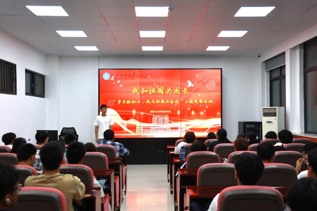 活动伊始,学院员工会主席张子超介绍了本次活动的背景,将宏大的“家国情怀”与细腻的“亲情牵挂”紧密联结,为整场活动奠定了温暖的基调。随后,同学们共同观看了影片《我和我的祖国》。从开国大典的升旗仪式到香港回归的历史时刻,再到神舟返回舱的成功着陆,一个个关乎国家与个人命运交织的经典片段,让在场学子深刻体会到“家国相依”的深厚内涵与时代分量。放映结束后,同学们手持鲜艳的小国旗,在镜头前留下了一张张“与祖国同框”的珍贵影像,用青春的笑颜致敬伟大时代。