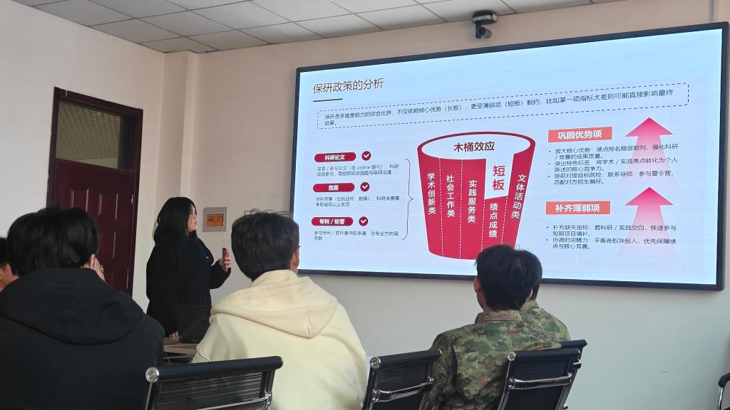 本次活动由国旗护卫队党支部张旻暄同志担任主讲,她围绕保研经验进行了系统分享:从前期准备中的时间规划、问题思考与信息搜集,到对保研政策的解读及成绩构成的剖析;随后结合自身经历,讲述了从启动准备到具体落实的整个过程,并在时间管理与计划制定等方面提供了切实建议。分享过程中,张旻暄还借助“木桶效应”强调,保研是对综合能力的多维度考察,应在巩固优势的同时补齐短板。通过她的细致讲解,队员们对保研流程与准备要点有了更为清晰的认识。