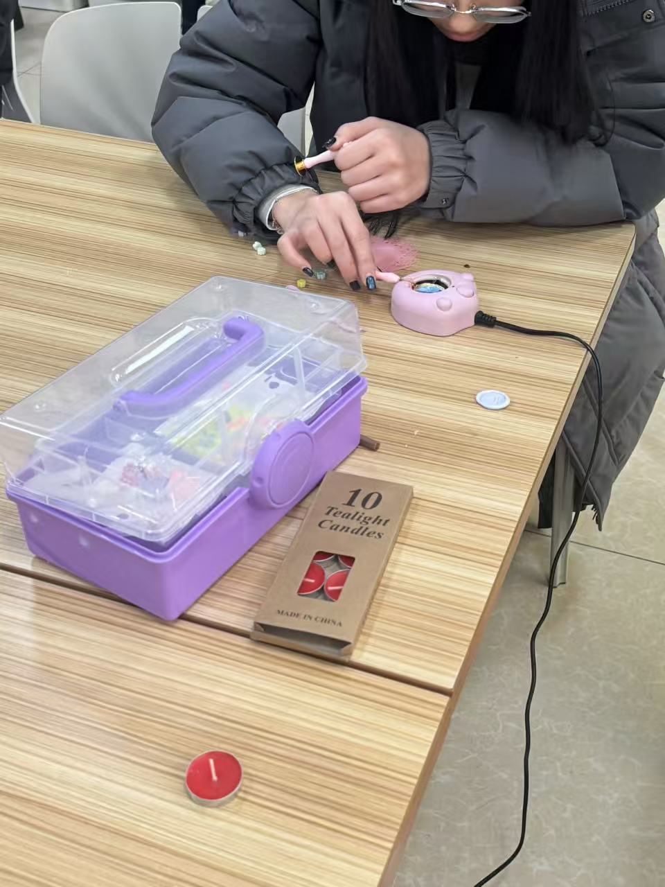创作过程中,同学们热情高涨,充分发挥想象力与创造力。手工基础较弱的同学从纯色基础款入手,感受蜡液凝固成型的奇妙过程;追求个性的同学则大胆尝试多色蜡粒混熔,打造出渐变撞色的独特效果;不少同学还巧妙嵌入干花、金粉等装饰元素,或通过多枚印章叠加拼接,制作出主题贺卡、创意书签、纪念册扉页等作品。现场不时响起交流探讨的欢声笑语,同学们分享着配色心得与创意构思,在互动中增进了彼此的友谊。