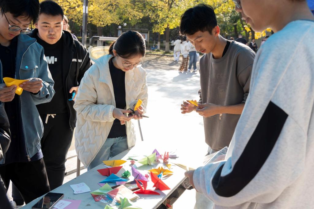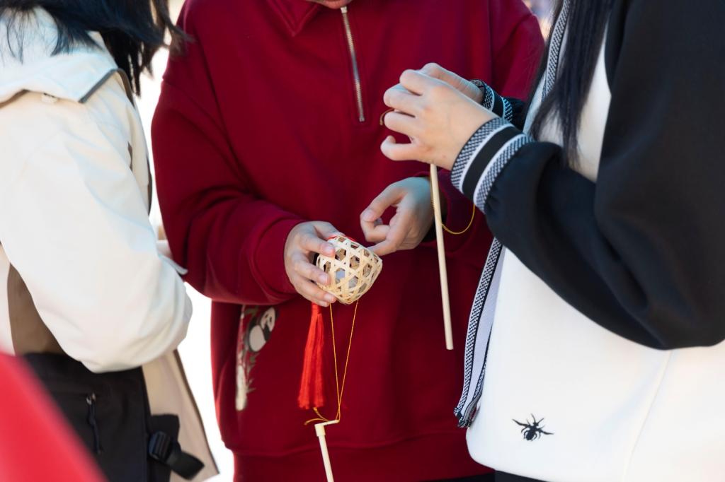 活动设置妙手编灯、你画我猜、祝福盲盒、巧折纸鸢四大特色环节。编灯区内,同学们跟随志愿者学习“井字锁篾法”,亲手制作60盏茱萸灯并题写祝福;你画我猜环节以重阳民俗为关键词,让同学们在欢笑声中熟悉登高、佩茱萸等古老习俗;祝福盲盒通过“抽取—赠予”的双向互动,传递陌生人间的温情;巧折纸鸢环节里,同学们写下对长辈的祈愿,在夕阳下放飞思念。
